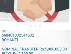 Melihat dari tanda bukti transfer tersebut terlihat jelas judul nya untuk ” PEMBAYARAN UANG TOLAK SUPARDIYANTO. B” ke rek BRI atas nama istri yang bersangkutan, Sampai berita ini diterbitkan yang bersangkutan belum bisa dihubungi awak media (Tim/Red)